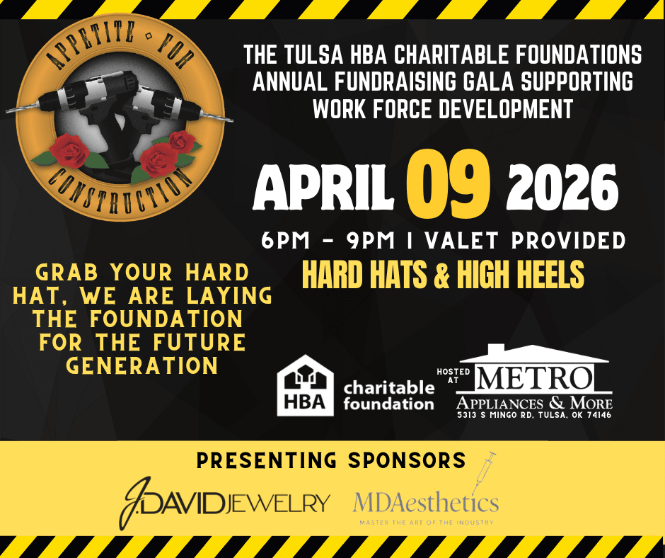 Join us for Appetite for Construction 2026, the Tulsa HBA Charitable Foundation’s annual fundraising gala supporting workforce development and construction education in our community. This high-energy evening—Hard Hats & High Heels—features great food, drinks, and hands-on experiences, all benefiting programs that prepare the next generation of residential construction professionals.