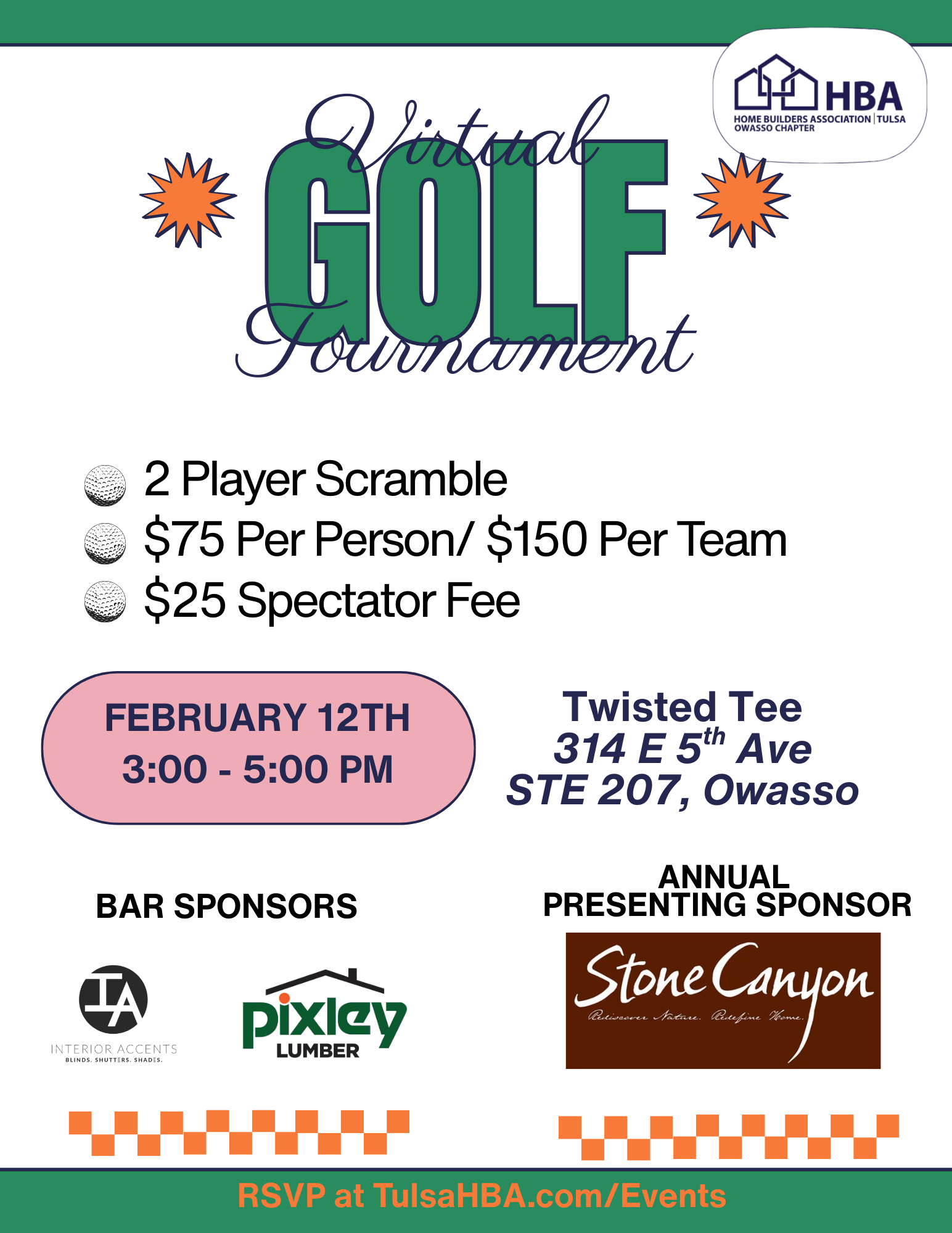 It’s tee time! Join the Owasso Chapter for our annual Virtual Golf Tournament. Grab your clubs, bring a partner, and get ready to scramble your way to the top! 2-Man Scramble // Double-Bogey Max // NO Putting