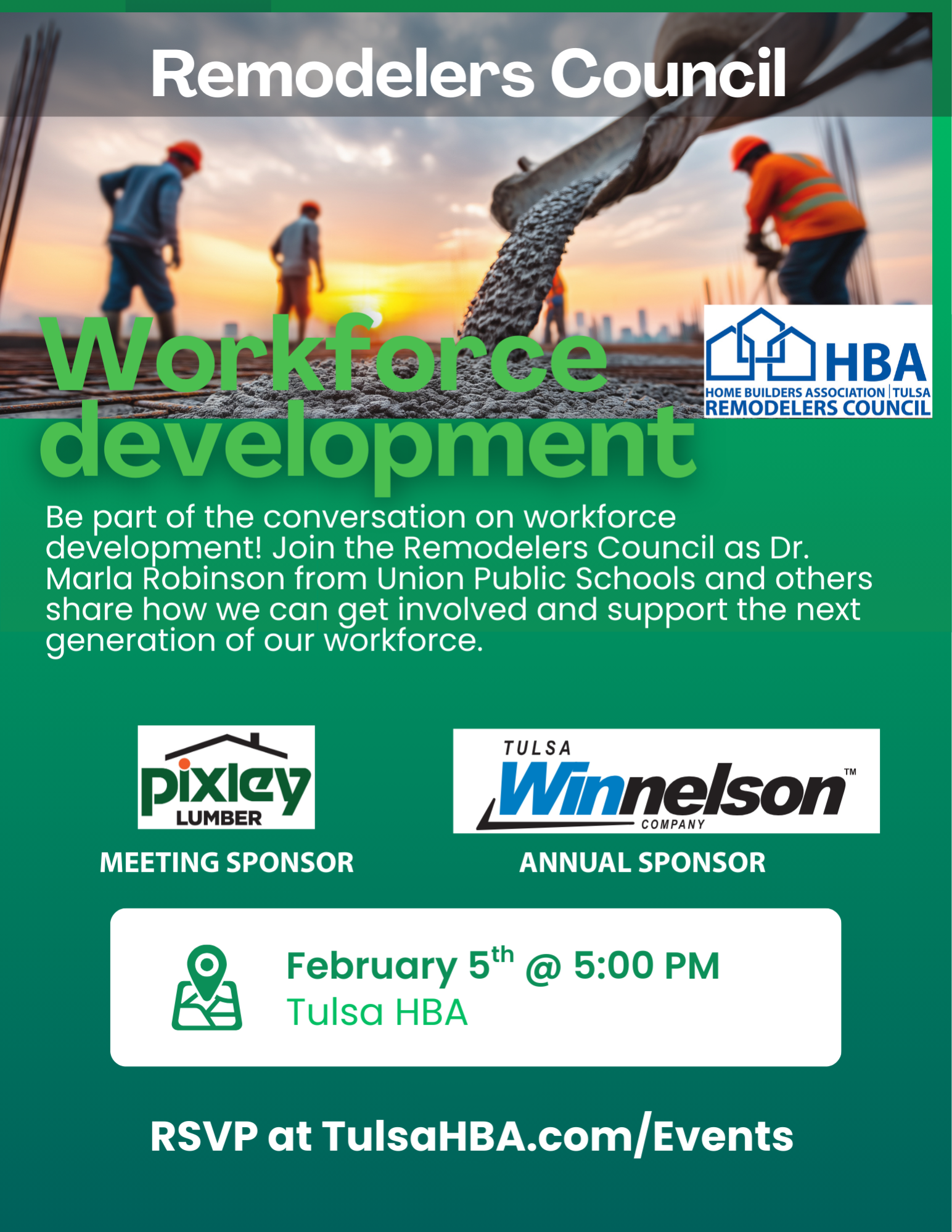 Be part of the conversation on workforce development! Join the Remodelers Council as Dr. Marla Robinson from Union Public Schools and others share how we can get involved and support the next generation of our workforce.